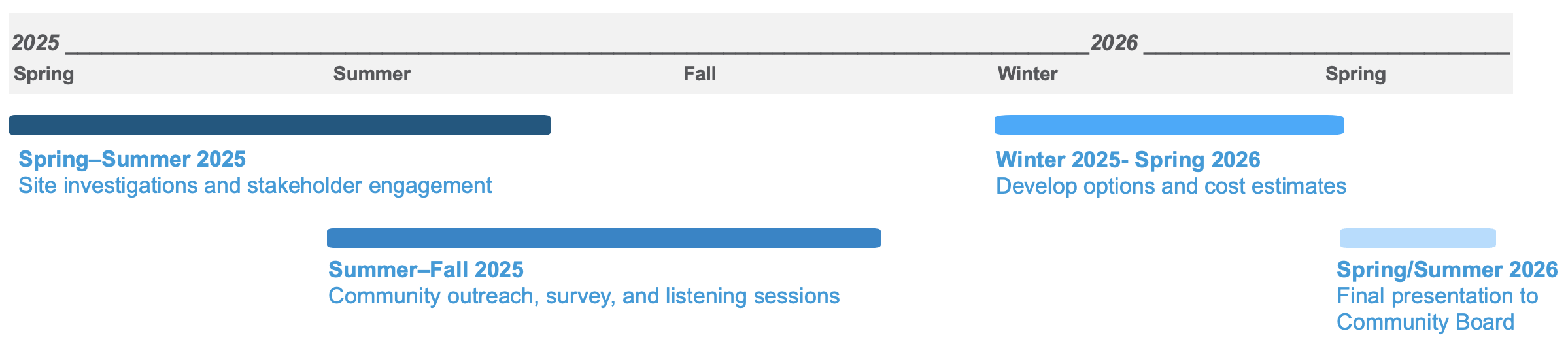 The scope of the study is to investigate existing conditions, identify and evaluate feasible options for addressing the issues, and prepare cost estimates. NYC Parks will then use the cost estimates to pursue funding for a capital project to implement a solution.